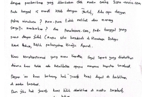Minahasa, zona-nesia.com – Sosok VSS alias Ci Vee akhirnya memberikan klarifikasi terkait pemberitaan dugaan keterlibatannya dalam aktivitas penimbunan BBM bersubsidi jenis Bio Solar di wilayah Minahasa. Melalui hak jawab yang disampaikan kepada media pada 17 Maret 2026, Ci Vee dengan tegas membantah seluruh tudingan yang menyebut dirinya mengoperasikan jaringan pengumpulan hingga distribusi solar subsidi ke…