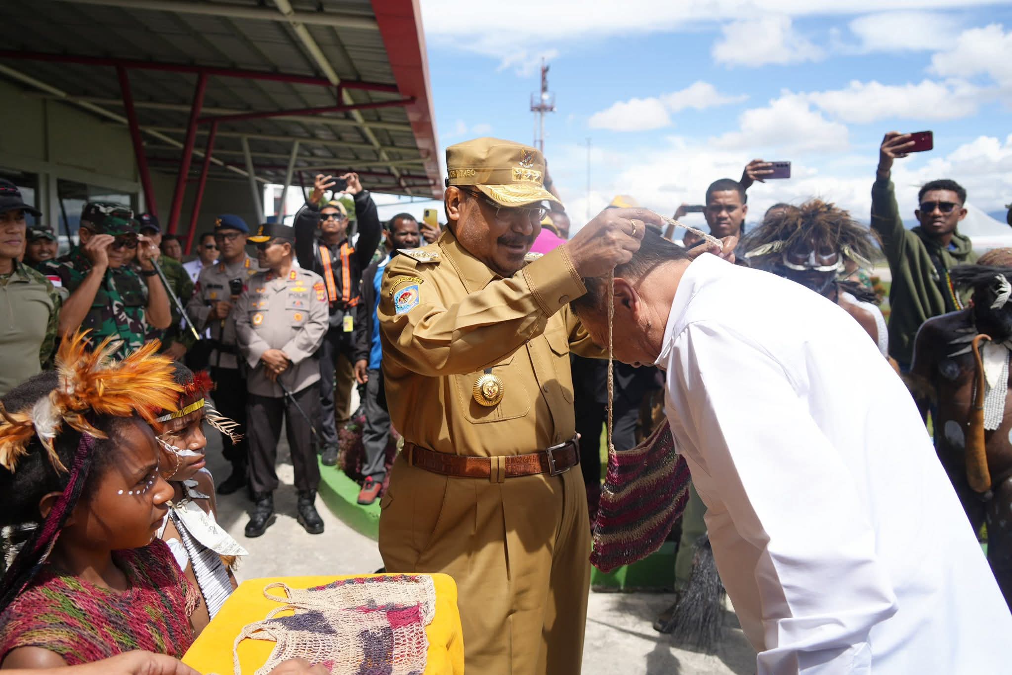 Menko Djamari dan rombongan tiba di Bandara Wamena pada Selasa pagi. Mereka disambut dengan tarian adat khas serta prosesi pengalungan noken oleh Gubernur Papua Pegunungan John Tabo.